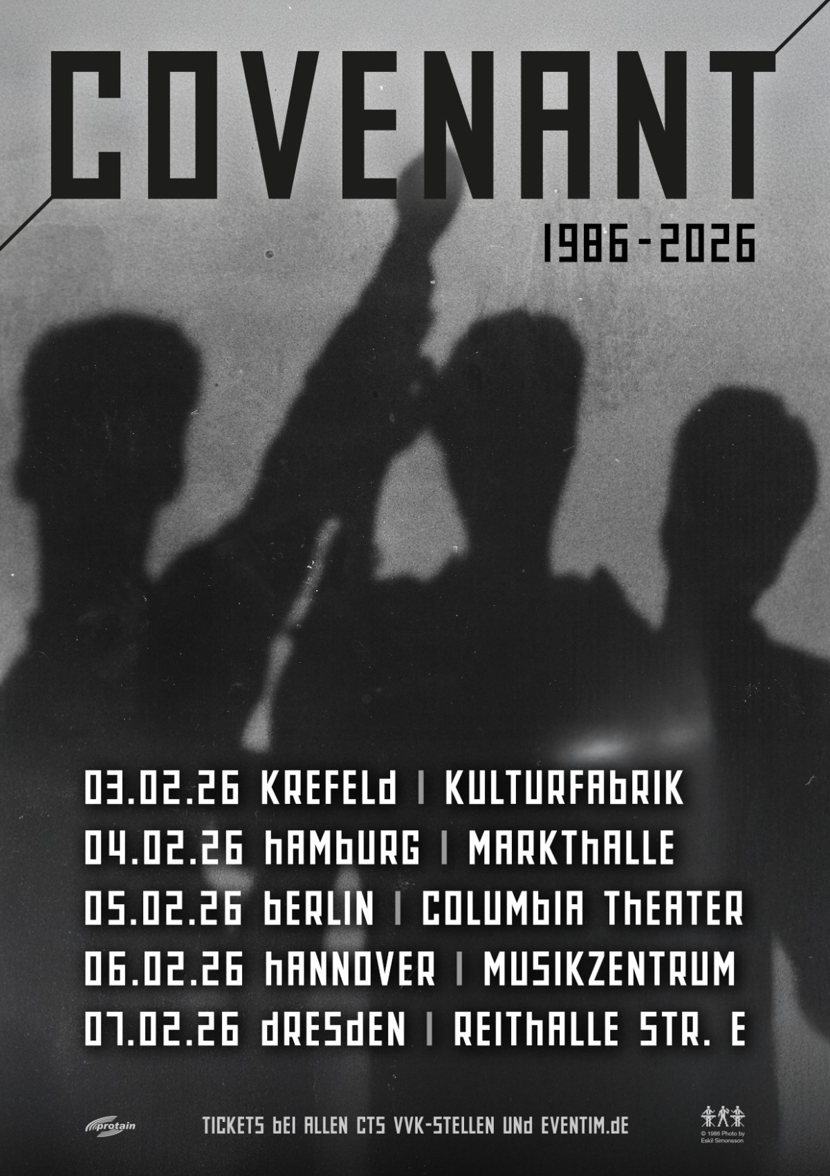 Am 26. April 1986, am Vorabend der Katastrophe von Tschernobyl, wurden Covenant gegründet, nachdem sie in Malmö im legendären Veranstaltungsort Stadt Hamburg von Front 242 geblendet worden waren. Die aggressiven Beats und die kompromisslose Haltung, gemischt mit dem Pop-Flair ihres neuen Songs „Don’t Crash“, hinterließen einen tiefen Eindruck und nur fünf Monate später hatten Clas, Eskil und Joakim ihren ersten Auftritt mit eigenen Songs. Seitdem ist die Band in 42 Ländern auf sechs2026 möchte die Band auf diese Jahre zurückblicken und lädt dazu ein, 40 Jahre „Pop mit Ecken und Kanten“ zu feiern. In einer Reihe von ausgedehnten Konzerten, die zweieinhalb Stunden dauern, wird die Band Songs aus jedem Album spielen, wobei die Setlist von den Fans gewählt wird. Die Gründungsmitglieder Joakim Montelius und Eskil Simonsson arbeiten derzeit an einem neuen Album. Kontinenten aufgetreten und hat über 120 Songs veröffentlicht.